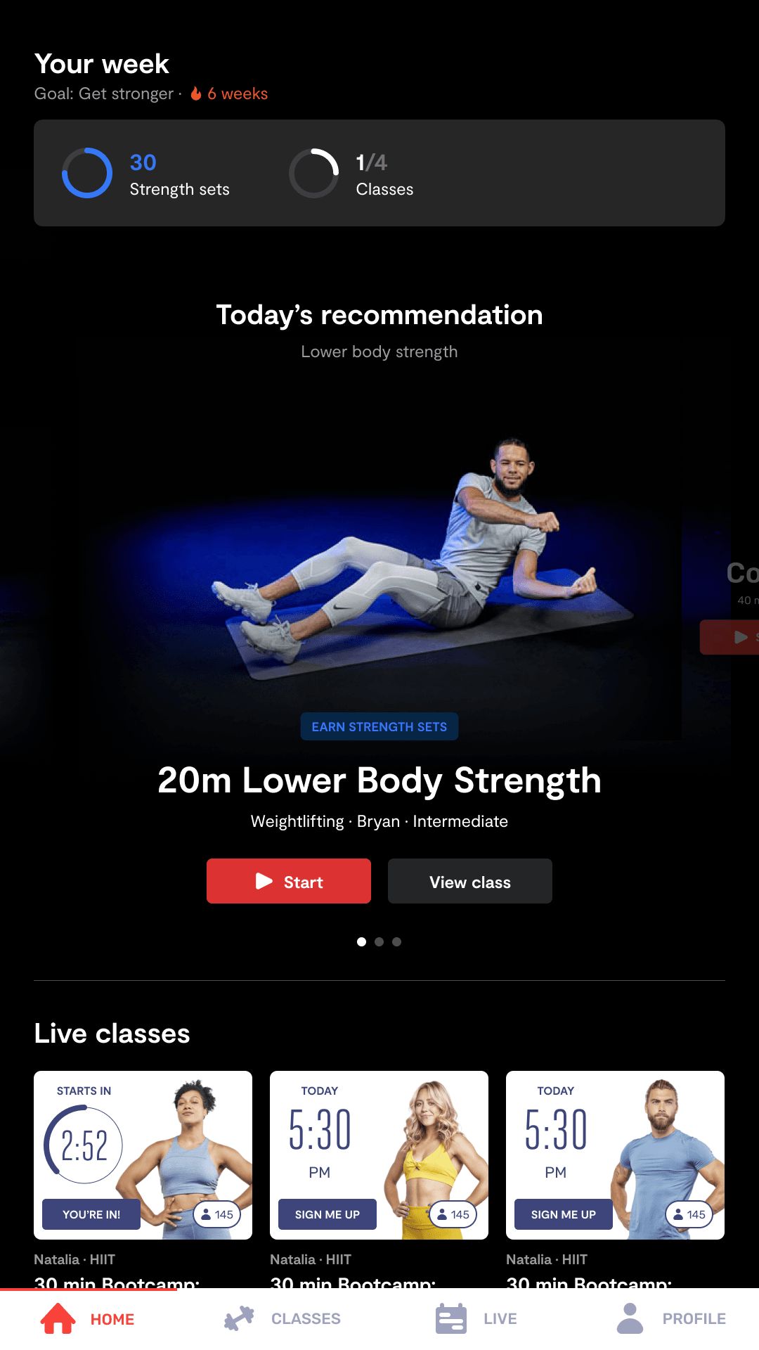 Depending on your personal fitness goal — whether it’s to get stronger, improve definition, lose weight, or get healthier — you’ll see different post-class metrics that are key to your goals: Strength Sets, which indicate how many heavy weighted exercises you completed by muscle group; Calories, as calculated by our algorithm; Intensity Minutes, that tracks how many minutes in heart rate zones 3-5; and Active Minutes, which is how much time you spent moving your body over the course of a week.